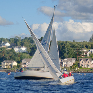 In stark contrast to Tuesday evening, Wednesday brought a brisk north westerly wind that kept the crews on their toes. Race officer Bill Aitchison opted for a long course using the entire length of the Holy Loch, from near the marina, then almost down to Strone Pier on the first lap and down to Hunters Quay on subsequent laps.