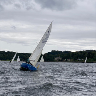 In the first race Jim Hoey in the J30 Judicious led the 4 White sail boats up the beat to the Hafton mark, closely pursued by the Duncan Chalmers in UFO27 Aria and newcomers to the class Fin Hurrel, Harris Munns, James Russel, Ross Noble in the J24 Mike Honcho. All four learnt to sail through the Holy Loch Sailing Club cadet program which introduces youngster to the sport. Nigel Scriven in the Sonata Moonlight was struggling with the wind as he was overpowered with a full sail plan, brought up the rear. While Judicious stayed ahead to the finish, with the J24 following, it was Duncan Chalmers in Aria that won on corrected time, with Fin Hurrel second, and Moonlight third.